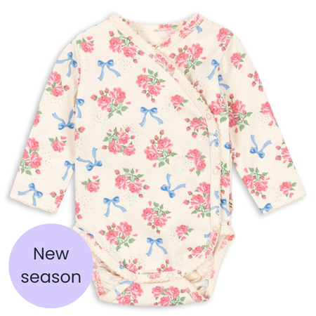 Soft long-sleeved wrap bodysuit with a kimono-style opening that is easy to put on.
