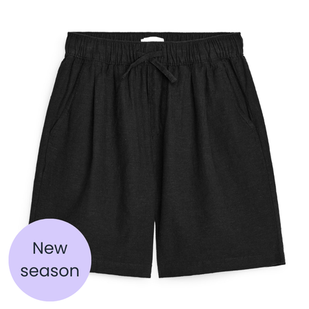 ARKET black linen shorts. Shorts in a tactile cotton linen blended weave. An elasticated drawstring waist allows for a comfortable, adjustable fit. Pockets at side seams.