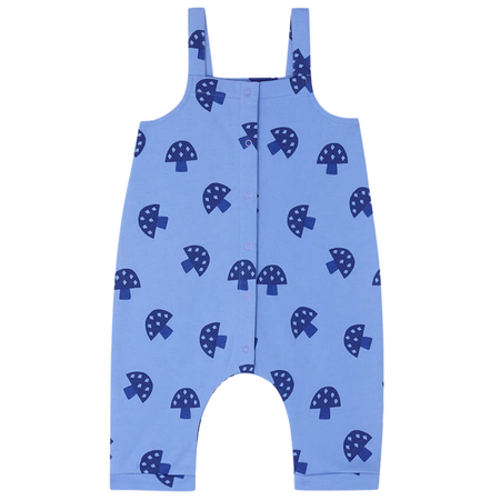 All over mushroom print soft terry dungaree in blue with popper front for easy dressing. Made from 100% GOTS certified organic cotton.