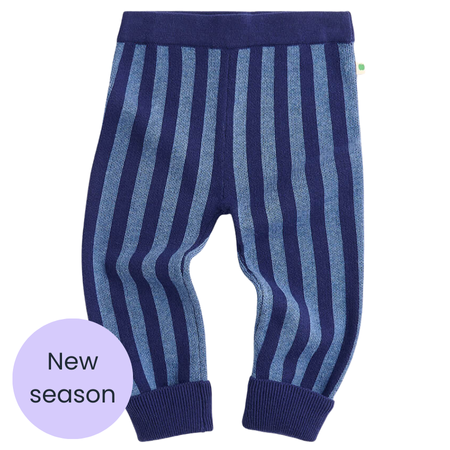 The Bonnie Mob 'Albie' stripe knit trouser in dusty blue. Dusty Blue / Navy stripe jaquard knit trousers, with turned up cuff detail. Made from 100% Organic Cotton for super softness against your little ones' skin. The knit is thick and warm as it has several layers of knit within the jaquard.