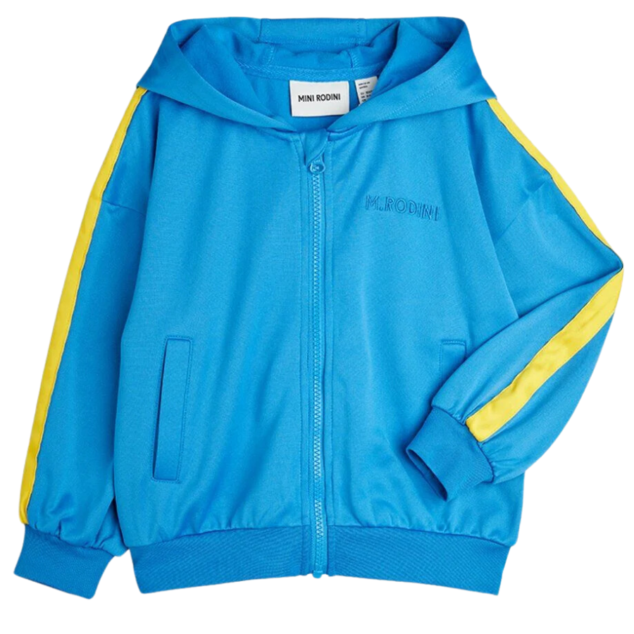 Mini Rodini WCT hoodie. Made from 100% recycled polyester, offering a soft and comfortable feel with a sporty look. Designed with a practical front zipper, a cosy hood, and contrasting stripes along the sleeves for added detail. Features ribbed cuffs and hem for a snug fit, along with two front pockets for functionality.