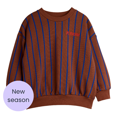 Mini Rodini brown sweatshirt with blue vertical stripes. Jumper with a M.Rodini patch on the chest, made from 100 % GOTS certified organic cotton. Designed for a relaxed fit with dropped shoulders and finished with ribbed elastic trims.