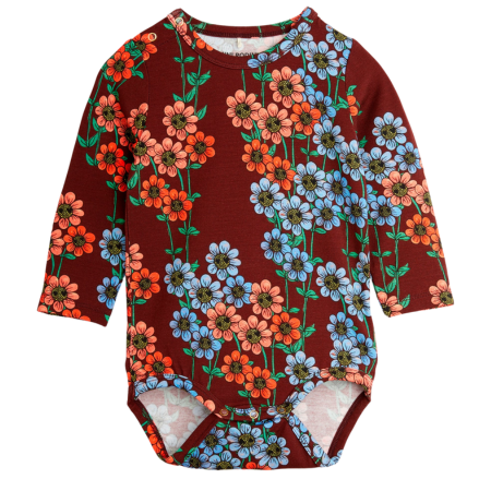 Mini Rodini burgundy daisy long sleeve bodysuit with all-over flower print. Poppers at the shoulder for easy dressing. Made from 95% TENCEL™ Lyocell and 5% elastane for stretch.