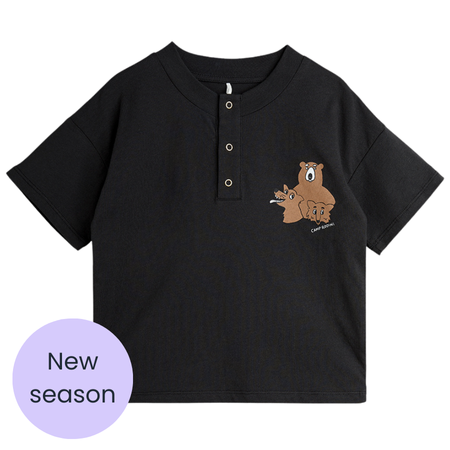 Mini Rodini 'Camp Rodini' black t-shirt with button detailing, made from 100 % GOTS certified organic cotton.