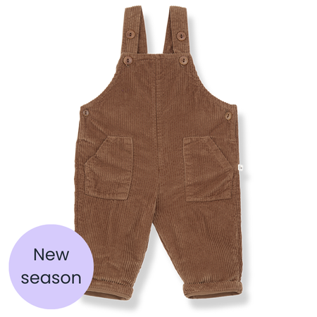 ‘Benoit’ corduroy dungarees in 'castagna', a chestnut brown, with button adjustable straps and elasticated cuffs to ensure a comfy fit for your little one. Made in Spain.