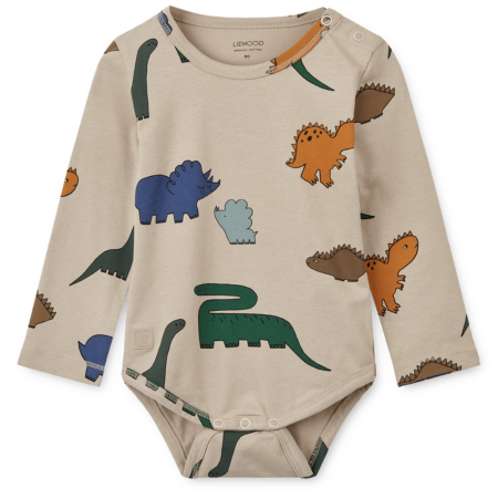 LIEWOOD dinosaur long sleeve bodysuit. The organic cotton material is soft and breathable, perfect for everyday wear. Poppers on the shoulder and bottom popper fastening make for quick and easy changing. Made with soft and durable 95% Organic cotton and 5% Elastane.