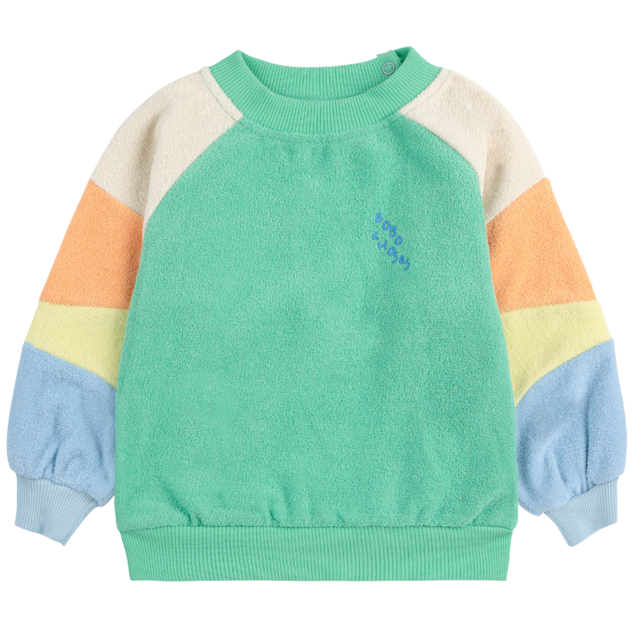 Bobo Choses green, yellow, orange blue and white colour block jumper. Soft and refreshing, with a terry cloth feel, this light green sweatshirt is ideal for everyday moments of joy. Features long raglan sleeves, ribbed cuffs, and a ribbed bottom for added comfort. Responsibly made in Spain with respect for the planet.