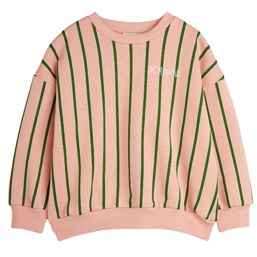 Mini Rodini pink sweatshirt with green vertical stripes. Jumper with a M.Rodini patch on the chest, made from 100 % GOTS certified organic cotton. Designed for a relaxed fit with dropped shoulders and finished with ribbed elastic trims.