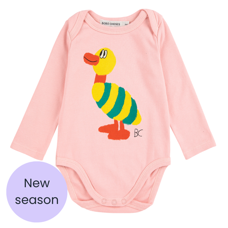 Bobo Choses 'striped duck body' in light pink with fun striped duck print. Designed with long sleeves, shoulder snap fastening, crotch snap fastening, slim fit and round neck. Responsibly made in Spain.